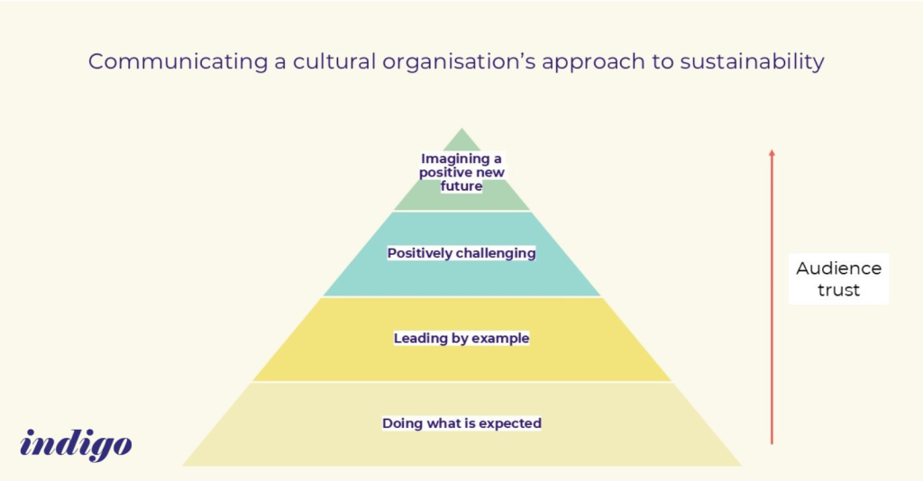 In our suggested model of communication, these things need to be related. If you don’t consistently communicate that you’re getting the fundamentals right, and show that you’re leading by example, why wouldn’t your audiences be hesitant when you ask them to be part of a conversation about climate change, or start creating work or stories around the climate to help them imagine a new future?